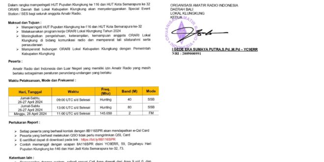PEMALANG, Rabu, 8 Mei 2024. ORARI Lokal Kabupaten Pemalang akan menjadi tuan rumah Ujian Negara Amatir Radio pada hari Minggu tanggal 19 Mei 2024 bertempat di SMKN 01 Pemalang https://maps.app.goo.gl/EGeXvNeeH2jN5WCC9 Buat Masyarakat yang mempumyai Radio Komunikasi dan gemar mengudaraAyo persiapkan diri untuk menjadi anggota ORARI.Lengkapi diri dengan Surat Ijin yang …